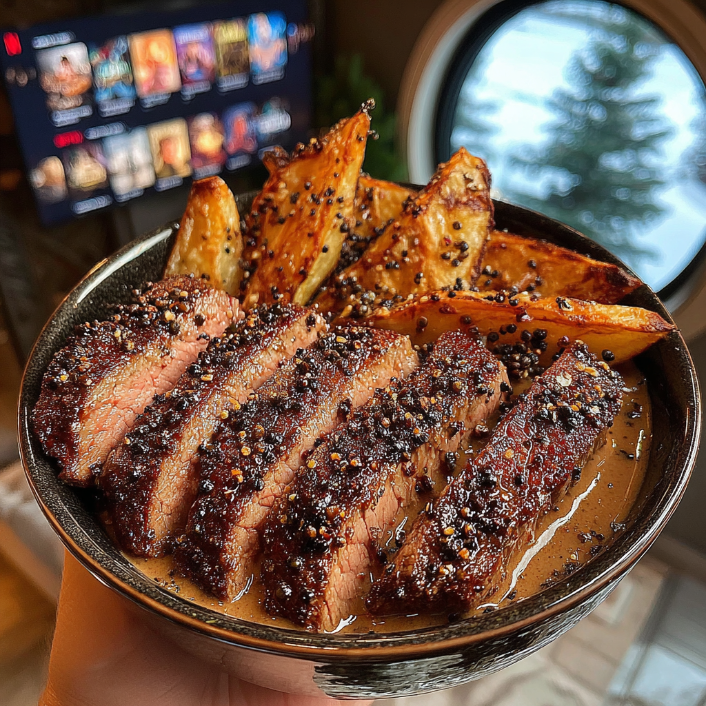 Blackened Peppercorn Strip Steak with Rosemary-Salted Wedge Fries and Rich Onion Jus Sauce